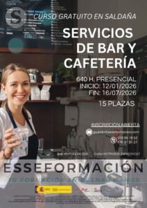 La segunda acción es el Certificado Profesional de Servicio de Bar y Cafetería, que se desarrollará en Saldaña y tendrá una duración total de 640 horas, distribuidas en 7 módulos formativos. A lo largo del curso, el alumnado adquirirá competencias para prestar servicios de alimentos y bebidas, elaborar preparaciones culinarias, aplicar técnicas de servicio con autonomía, recomendar vinos, utilizar la lengua inglesa cuando sea necesario y cumplir las normas de cortesía, seguridad e higiene alimentaria.